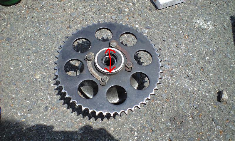 写真だとハブの一部とくっついてるけど、外してスプロケ単体にすると、真ん中の穴の大きさが赤矢印の幅になる。