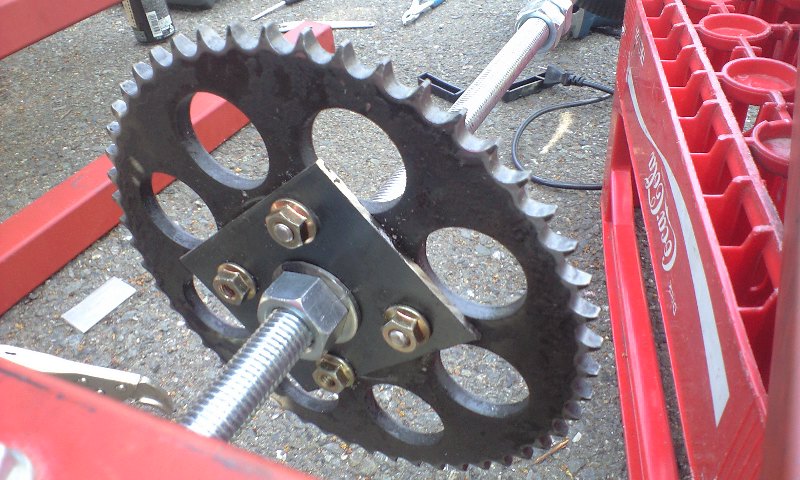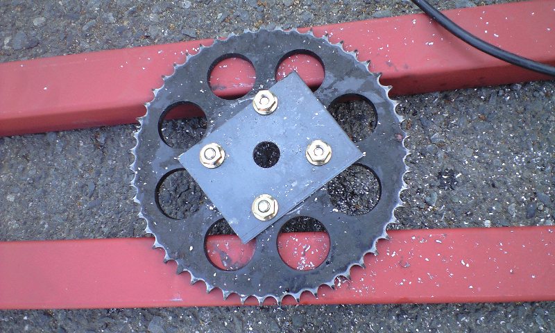 結局、鉄板を切り出して、4つのボルト穴を開けてスプロケと固定。