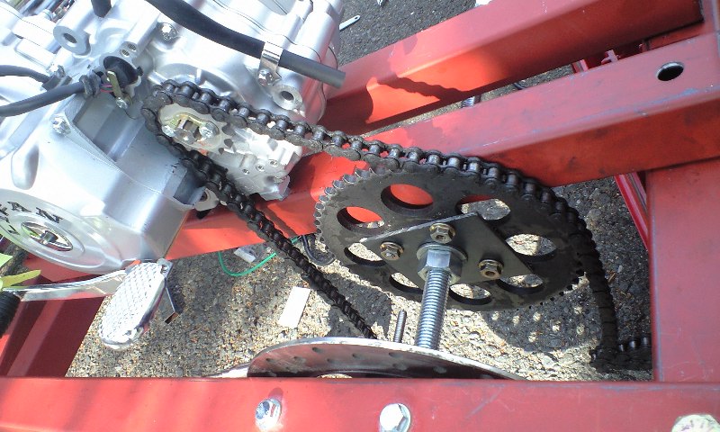 シャフト側のリアスプロケとエンジン側のフロントスプロケにチェーンをかけて、位置調整をしてるところ。